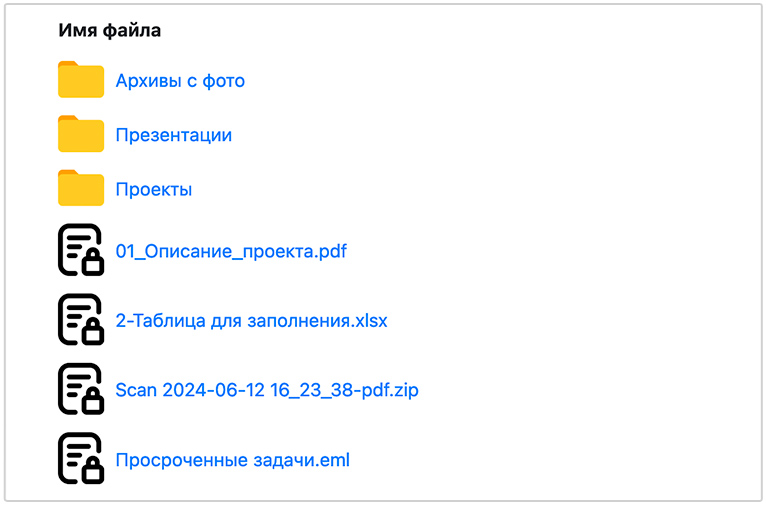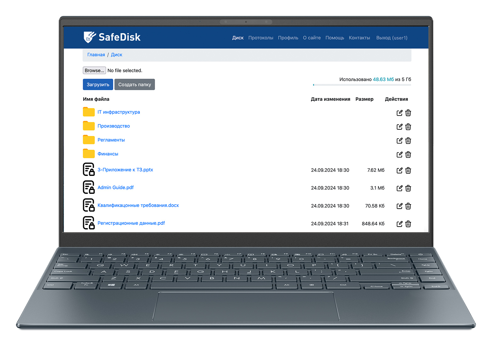В SafeDisk можно хранить любые файлы — это могут быть тексты, таблицы, архивы, проектные файлы. Все файлы хранятся в защищенном частном облачном хранилище. Структура повторяет структуру обычного диска — можно создавать папки любого уровня вложенности, количество файлов неограниченно в любой папке.