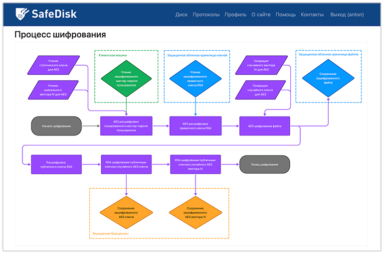 Все файлы и данные максимально защищены при помощи пользовательского мастер-пароля и гибридной системы шифрования, совмещающей преимущества криптосистемы RSA с открытым ключом с производительностью симметричной криптосистемы AES. Даже если произойдет утечка данных, то расшифровать ничего невозможно. Подробнее о шифровании и мерах безопасности SafeDisk можно прочитать на странице «Безопасность».