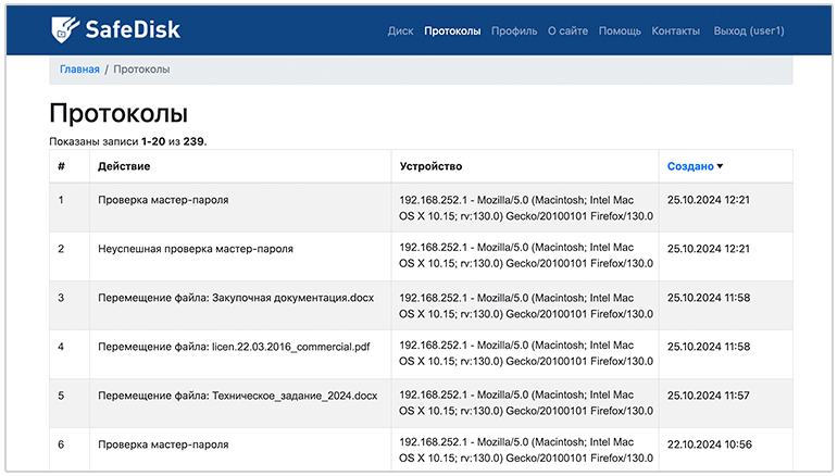 Ведется протоколирование всех действий — от входа в аккаунт и проверки мастер-пароля до удаления всех заметок или очистки сессии. Записываются как действия, так и IP-адрес и устройство пользователя. Протоколы удалить или очистить невозможно.