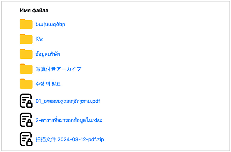 С диском можно работать на любом языке — ваши файлы и папки могут быть названы на русском, английском, казахском, армянском, японском, китайском, лаосском или любом другом языке. Длина имени файла или папки может достигать 1000 символов.