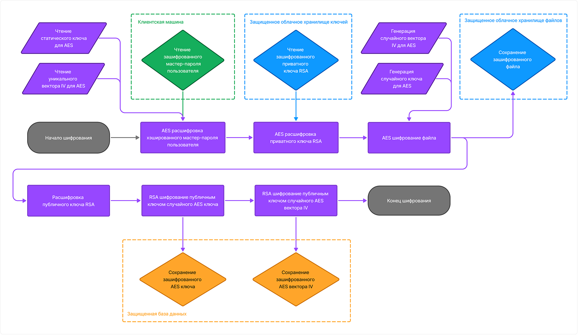 Шифрование начинается с расшифровки ключа RSA (2048 бит), зашифрованного алгоритмом AES, ключом для которого выступает хэшированный мастер-пароль пользователя (256 бит). Далее генерируются случайные AES ключ (256 бит) и вектор инициализации (128 бит), которыми шифруется файл алгоритмом AES-256. Для каждого файла создаются свои уникальные случайные криптографически стойкие ключ и вектор. После этого ключ и вектор инициализации шифруются публичным ключом RSA и сохраняются. Зашифрованный файл отправляется в защищенное облачное хранилище Yandex Cloud. Ключи RSA, ключ и вектор инициализации AES — все находятся в разных местах гибридной системы, а хэшированный и зашифрованный мастер-пароль пользователя находится на его собственной машине, поэтому злоумышленнику, чтобы прочитать любой файл, надо получить доступ ко всем блокам системы. Если он получит доступ только к одному блоку или даже трем из четырех, то не сможет прочитать ровным счетом ничего. Нигде в системе ключи не хранятся в открытом виде, только в зашифрованном.